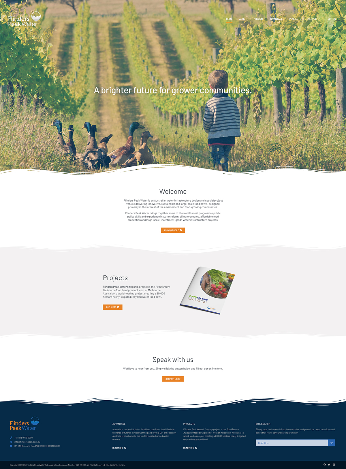 Flinders Peak Water develops sustainable food bowls and large-scale water infrastructure solutions for communities. Its website build showcases innovation and environmental stewardship, reflecting the company’s vision of resilience and sustainability. The platform communicates complex projects with clarity, appealing to stakeholders and partners. It reinforces the business as a forward-looking driver of food security and ecological care.