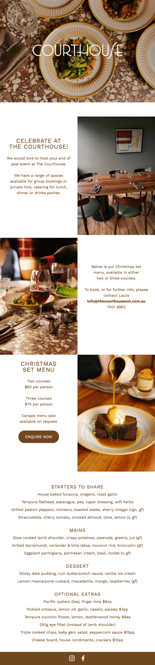 These email campaigns blended storytelling with visuals to highlight seasonal menus, special events, and news for Naughtons Hotel and The Courthouse. Each EDM was tailored for hospitality, capturing character while encouraging bookings.