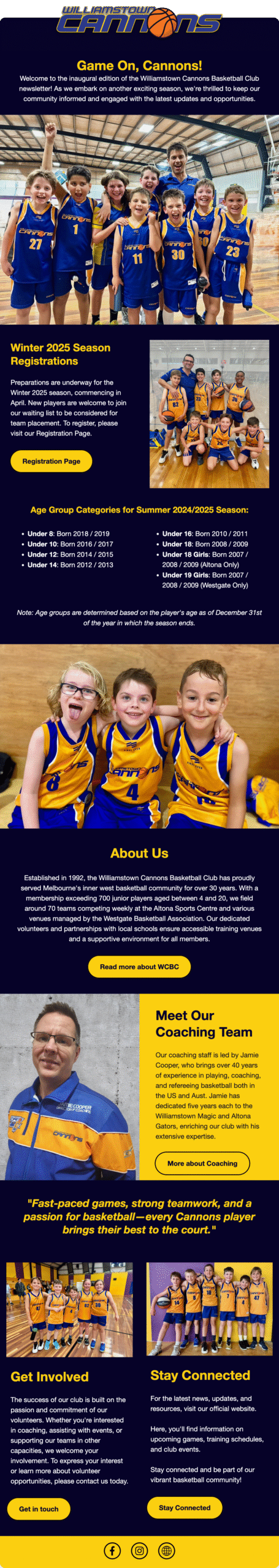 The WCBC EDMs were built for club communication, covering registrations, events, and updates. They combined energy and clear messaging with a family-friendly look and feel, ensuring accessibility for parents, players, and supporters.