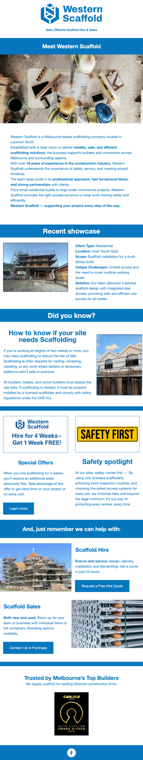 These EDMs delivered a strong, consistent presence for Western Scaffold, balancing clarity with brand identity. Each design reinforced the company’s expertise while ensuring campaigns were engaging, mobile-friendly, and visually aligned with their industrial focus.